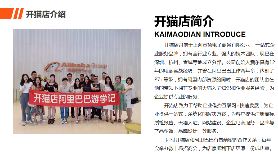 开猫店(www.kaimaodian.com)是上海宣扬电子商务有限公司(www.shanghaixuanyang.com)旗下电商品牌,专为大小商家提供天猫代入驻,解决天猫入驻难的平台,也是天猫认证的金牌服务商。提供一对一资深24小时顾问服务,定期联合天猫发布招商会,定向邀约商家入驻,为商家提供服务商专用星级绿色通道入驻,成功率高达98.8%,签订正规法律合同,下店后再付款,保障商家的权益,实力代入驻!
