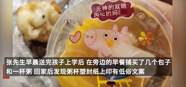 学校旁早餐铺粥杯印脏话,家长:店附近就有两所学校