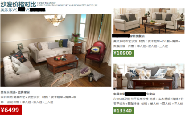 以客厅家居为例,蓝骑家居沙发“单人位+双人位+三人位”售价仅为6499元,不但低于某电商平台某品牌类似产品的10900元,更不到某卖场品牌专卖店13340元价格的1/2。