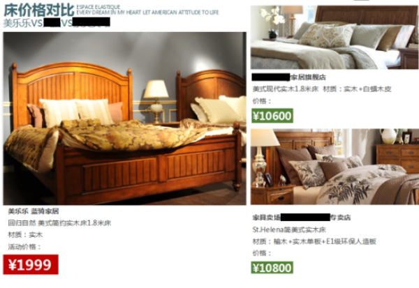更具“价格颠覆”意味的是蓝骑推出的简美风格双人床:类似的款式与材质、做工的产品,美乐乐渠道的价格为1999元,而品牌网店及卖场专卖店的价格分别为10600元与10800元。