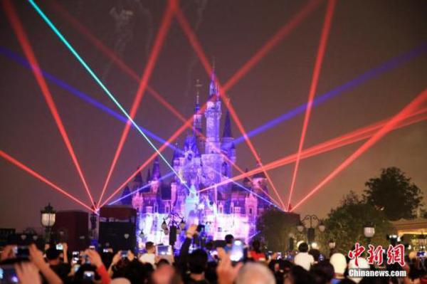 资料图:6月16日晚,美轮美奂的灯光烟花秀让上海迪士尼城堡变得幻彩无比,成当日上海迪士尼开园最华美绚丽的表演之一,吸引数万游客观赏。中新社记者 潘索菲 摄