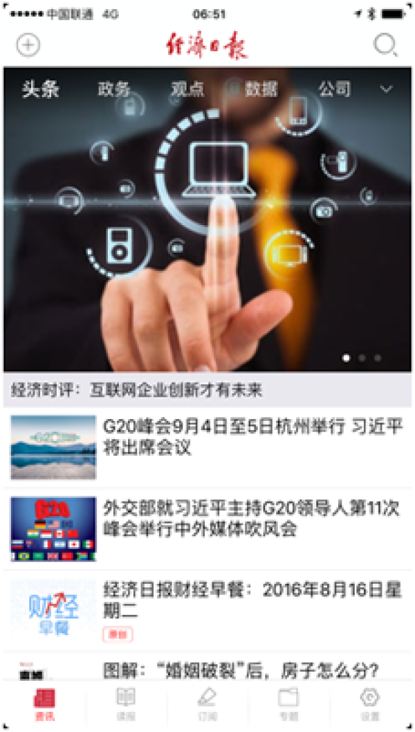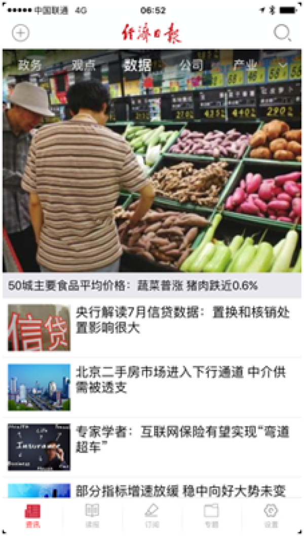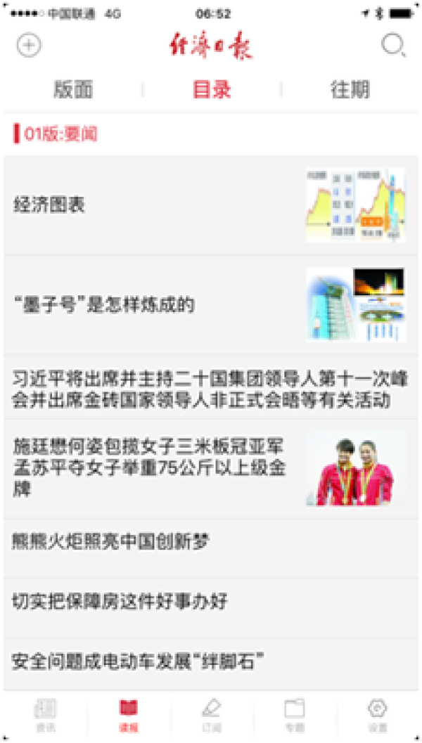 作为经济领域的权威媒体,“经济日报”新闻客户端延续了报纸报道专业、评论深刻的优势,并在适应网友个性与兴趣阅读等习惯上做了较大改进。目前“经济日报”新闻客户端的栏目设置分为资讯、读报、订阅、专题四大板块,各有其特色。