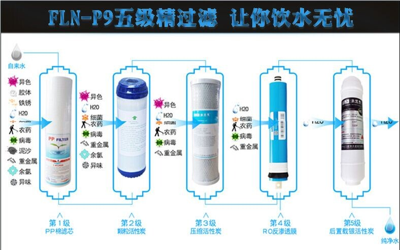 FLN-P9采用五级高精度过滤工艺,分别是精密5微米PP棉滤芯——颗粒活性炭滤芯——压缩性活性炭滤芯——超大流量400G反渗透RO膜——后置载银活性炭,前三级滤芯采用外量式滤芯设计,极易操作,更换滤芯超便捷。