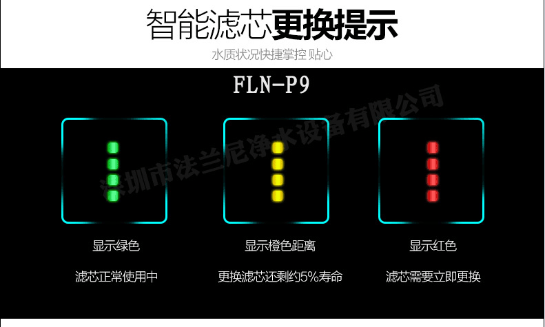 FLN-P9采用液晶触摸屏设计,滤芯智能提醒,具有大屏智显的特点,它采用7.5×2寸液晶触摸屏设计,操作方便,时尚简约,自带滤芯提醒功能,机器工作状态一目了然。灯带递减滤芯智能提醒,灯带变化代表不同的工作状态:通过滤芯灯带格数递减显示滤芯的剩余寿命的变化,可提醒您及时更换滤芯、减少净水二次污染。