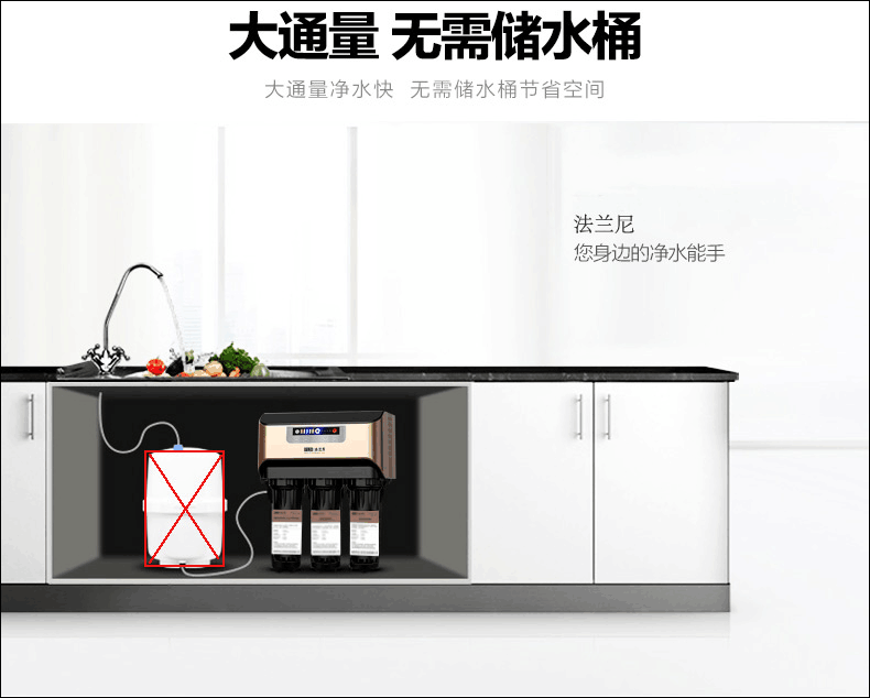 点评:400GRO膜,超大流量,满足用户大水量需求;2:1超低废水比,满足用户节水需求;0噪音,满足用户低噪音需求;3分进水口,满足用户一机两用需求;5级滤芯,满足用户高精过滤需求;7.5×2寸液晶触摸屏,满足用户大屏显示需求;无桶设计,满足用户节省空间需求。法兰尼净水器FLN-P9,一切只为解决用户需求而生。法兰尼FLN-P9,真正的净水器市场精品,多重亮点,实惠价格,大品牌,优质服务,给您最贴心的净水体验。