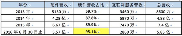 从招股书中可以看到,美图公司近几年来,最大的营收来源是其智能手机的销售。2015年和2016年上半年,二者分别占美图总收益的89.9%及95.1%,2016年上半年美图手机出货量近29万部,营收达到5.57亿。