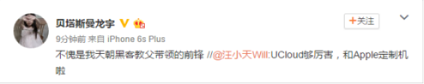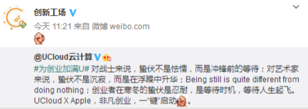 8月30日,UCloud云计算发布官方微博,正式对外公布携手苹果推出首款创业者定制Macbook的合作,给创业者送上最强创业装备!该微博一经发布,便获得了一众创投界大V的转发支持。