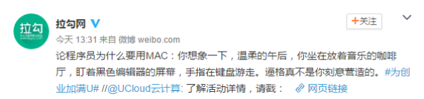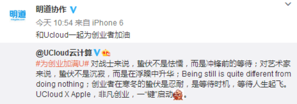 包括IMS新媒体商业集团CEO李檬、互联网圈微博KOL“黑客是这样练成的”、”万能的大熊”、“创意工坊”都纷纷加入了#为创业加满U#的后援大军。明道及梅花网创始人任向晖直接划出重点——Macbook打七折;知名招聘网站拉勾网上升到程序员逼格的高度,实打实卖安利;创新工场也通过一个助威表情满怀风情地进行了一波转发;而贝塔斯曼中国首席执行官龙宇更是直接夸赞UCloud CEO季昕华为“天朝黑客教父带领的前锋”。