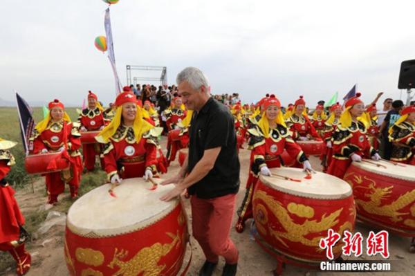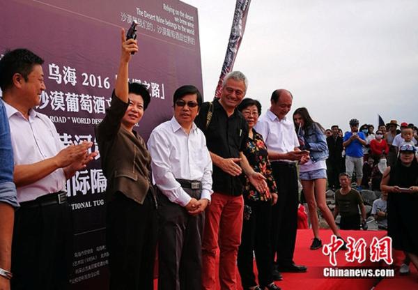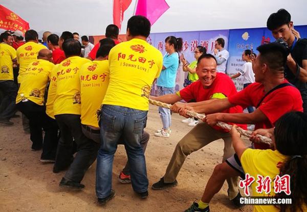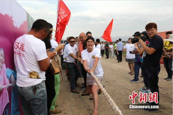 中新网9月6日电 昨天,中国·乌海2016“丝绸之路”世界沙漠葡萄酒文化节系列活动之国际隔河拔河比赛在乌海黄河海勃湾水利枢纽北8公里处举行。在拔河队伍中,不但有乌海当地种植葡萄的农民、葡萄酒庄酿酒工人、各葡萄酒庄的酿酒师和当地普通老百姓,还有来自13个国家的葡萄酒庄庄主以及国际葡萄酒小姐。