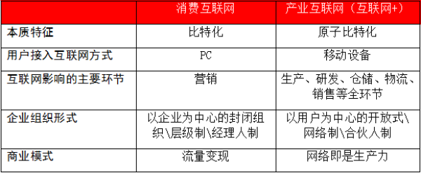 我们可以用一张图表来对比消费互联网时代和产业互联网时代(即互联网+)的不同。