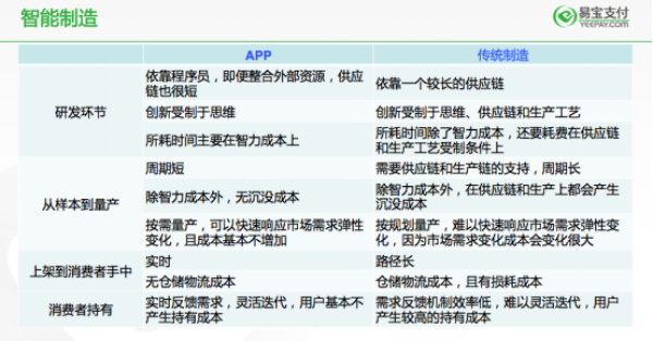如下图,是易宝支付对此做的总结对比。对比APP的研发制作和营销,传统制造更能看清未来的道路在哪里。