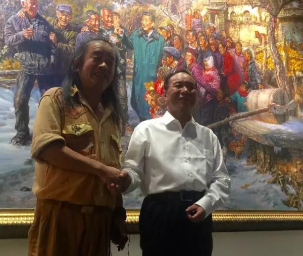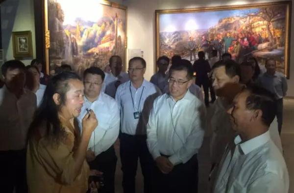曹勇大师向西藏自治区党委常委、拉萨市委书记齐扎拉(右)及他带领的西藏拉萨党政代表团、北京市副市长王宁(中)、北京朝阳区区长王灏(左二)等领导介绍巨幅油画《重返梁家河》