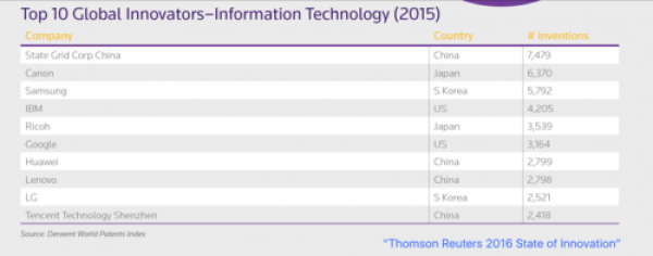 (汤森路透2016全球创新报告-全球信息技术创新排行榜,华为位列第七)