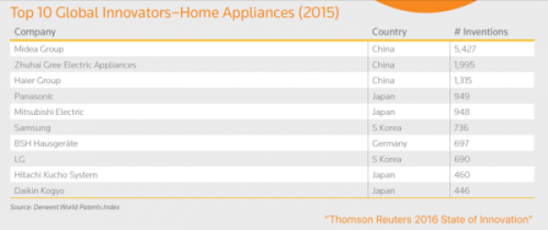 (汤森路透2016全球创新报告-全球家电技术创新排行榜,美的位列第一)