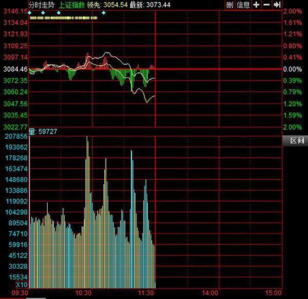 新华网北京10月21日电 周五早盘两市双双低开,盘中“中字头”和“一带一路”两板块的带领下,沪指快速走高,上摸3100点,沪指在触及3101.85点后,迅速跳水。截至午盘,沪指报3073.44点,跌0.36%,成交1269.97亿元;深成指报10694.49点,跌0.83%,成交1934.44亿元;创业板指报2171.64点,跌0.99%,成交557.68亿元。