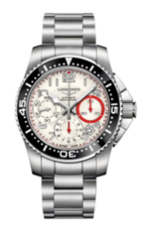 作为潜水腕表的典范之作,浪琴表康卡斯潜水系列旨在成为潜水员及水上运动爱好者的腕间伴侣。这款计时码表直径为41毫米,搭载浪琴表独家自动上链导柱轮机械机芯L688,显示时、分,日期显示出位于4:30位置。3时位置与6时位置分别设30分钟和12小时计时盘,小秒盘位于9时位置。乳白色表面上呈现9个涂有Super-LumiNova 夜光材料的阿拉伯数字时标。这款时计采用精钢表壳,配置螺旋式表冠、黑色单向螺旋式表圈以及表冠侧边防护装置。精钢表链为腕表增添动感。