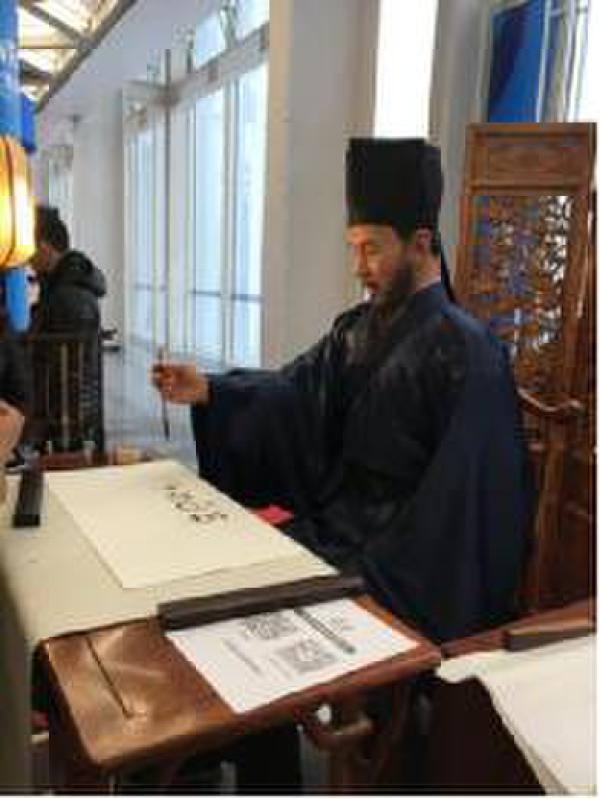 一进入会场首先看到穿着古装的机器人正在挥毫泼墨,这位留着黑色胡须、穿着古装的老先生以假乱真的本事不小,时不时还眨眨眼睛,皮肤和真人看上去极为相似。这就是“王阳明”仿真机器人,老先生对人们的要求来者不拒,一直在忙着给大家表演书法,“他”写的毛笔字盖上印章后,成为很多观众的收藏品。“老先生”的书法模仿了王阳明的字迹,还和王阳明一样,是位心理学家,能解答人们的心理问题!