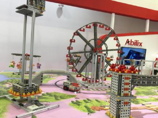在服务类机器人中,家庭教育机器人种类不少。各式各样的积木机器人很是抢眼,小小积木能够搭出大大的游乐场,拼装后的旋转木马、摩天轮在电脑程序控制下,现场转动。拼装的是积木玩具,拼装后靠程序控制动作的才是积木机器人,他们的积木机器人已经实现了六面搭建,可拼出更多的构型,机器人、机器狗都没问题,只要下载手机APP或者电脑程序,几岁的孩子也能完成简单的编程任务。在展示现场,积木机器人还搭建了一个正在工作的汽车生产线,让很少有机会去汽车厂的人们大饱眼福。