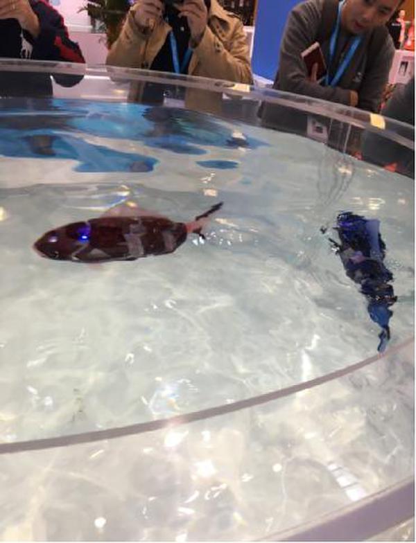 在会场,有一款仿生鱼机器人在水里游来游去引起人们关注,只见两条红色“锦鲤”在大玻璃缸里摇头摆尾,要不是鱼头上泛着的荧光有些蹊跷,几乎就能以假乱真。目前这款仿生鱼机器人主要以观赏为主,当然也可以接受一些水下作业,比如拍照、测水质等。目前机器人鱼并没有量产,只接受定制,大小、鱼种都可以改变,甚至连鲨鱼也能定制!