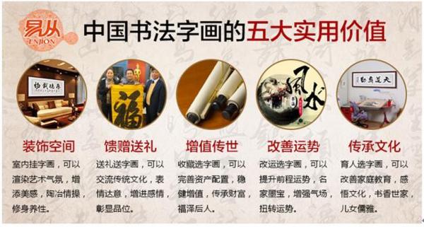 中国书法字画自古就十分值钱,中国书画一纸值万金, 绝非空言。如今书法字画在收藏界有很多收藏人士喜爱,现在人们更是把收藏的眼光投入到了当代名家的身上,这是因为,当代名家的书法字画作品,投资低,回报高,赝品少,升值快,而且还可以根据自己的需求,直接请【易从网】签约书画名家定制,因此当代书法字画收藏、投资成为时代的新宠。