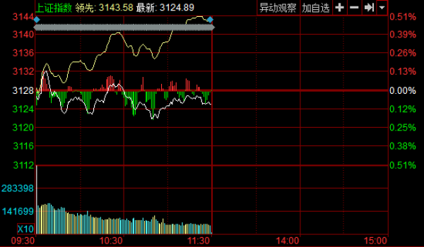 新华网北京10月25日电 今日两市近平开,随后热点题材窄幅回落,盘中指数震荡,沪指维持窄幅地位运行。截至午盘,沪指报3124.89点,下跌3.36点,跌幅0.11%,成交1225亿元;深成指报10857.12点,上涨14.48点,涨幅0.13%,成交1796亿元;创业板指数报2203.29点,上涨2.48点,涨幅0.11%,成交471亿元。