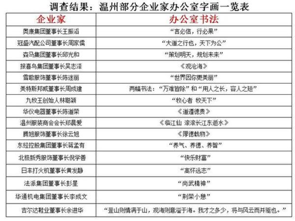 温州商报曾经对温州企业家办公室所挂字画做过专项调查: