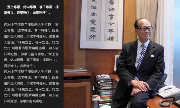 上面便是李嘉诚办公室字画内容,也是李嘉诚自称“近年来很喜欢的一副对子”,语出左宗棠:“发上等愿结中等缘享下等福;择高处立寻平处住向宽处行”。既是个人修养的体现,也是企业文化的承载。