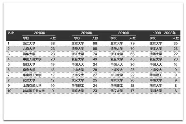 备注:2016年的数据来源于《2016信中利 胡润百富榜校友会特别报告》,上榜门槛为资产达到20亿;2014、2010的数据均来自于中国校友会网《21世纪人才网》,上榜门槛为10亿,该榜单的形成,参考了《福布斯富豪榜》《胡润百富榜》和《新财富百富榜》;1999-2008的数据亦来自于中国校友会网和《21世纪人才报》,上榜门槛的数据暂未查询到。