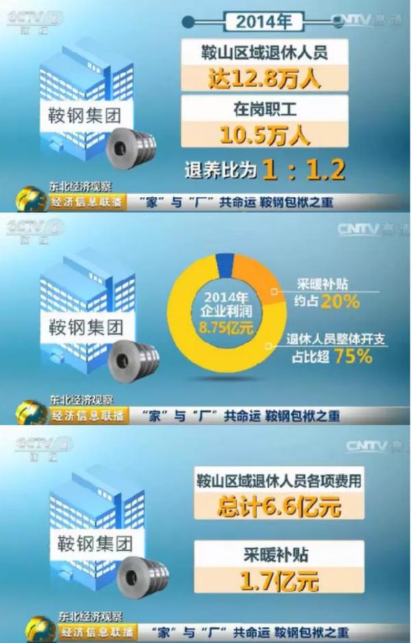记者了解到,2014年鞍钢集团仅鞍山区域退休人员的各项费用总计6.6亿元,采暖补贴一项就达1.7亿元。