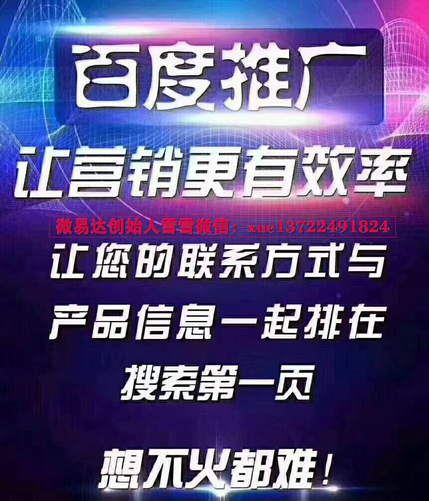 在已经是互联网时代的今天,很多时候,我们对于不了解的产品或者有需求的产品,都习惯上网搜索了解产品的价格,功能,质量,口碑等等信息,而网上直接这样搜索产品的一般都是对产品有兴趣,有购买欲望的,也就是产品的精准客户,如果我们的产品宣传广告第一时间被客户搜索发现,那还怕没有精准客户上门吗?所以说,我们只有把产品信息和自己的联系方式做到百度首页,这样才能达到最好的引流效果。微信号【13722491824】