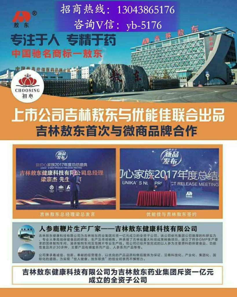 吉林敖东药业是老牌国有药企,技术实力非常雄厚。吉林敖东优能佳人参鹿鞭片为纯天然动植物提取物。采用世界顶级产品加工生产技术,配合全球各地最好的产品原料,提练有机人参、新西兰进口鹿鞭、进口牡蛎肽、新西兰进口鹿尾、宁夏枸杞王、秘鲁黑玛卡、九华黄精等精华,每一道工序都经过严格的质量把关。招商热线:13043865176