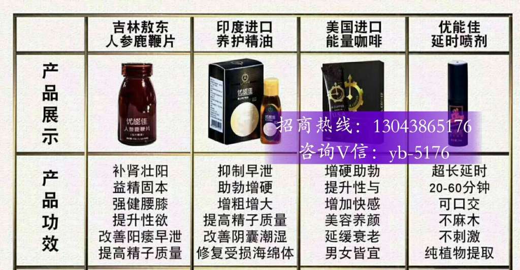 优能佳延时喷剂是一款安全舒心延时产品,外用型,即喷即有效。药物透皮吸收,起效及时,延时至少50-70分钟左右,无任何麻木感,时间延长增加快感,不麻木!原装美国进口,提取植物天然诱导成分,没有任何添加,补充养分,缓解疲劳,给你健康体魄。纯植物萃取,对身体没有伤害,不会造成依赖感,喷上时间保持3个小时。优能佳延时喷剂,已经走进了无数个家庭,成为拯救婚姻的秘密武器,只有性爱和谐,才能擦出爱的火花,生活才有激情和活力。让男人真正的做回自己,让女人真正的感受激情和快感。优能佳延时喷剂小巧方便,易携带,每次喷一喷,搭配美国能量咖啡轻松保持好状态。招商热线:13043865176