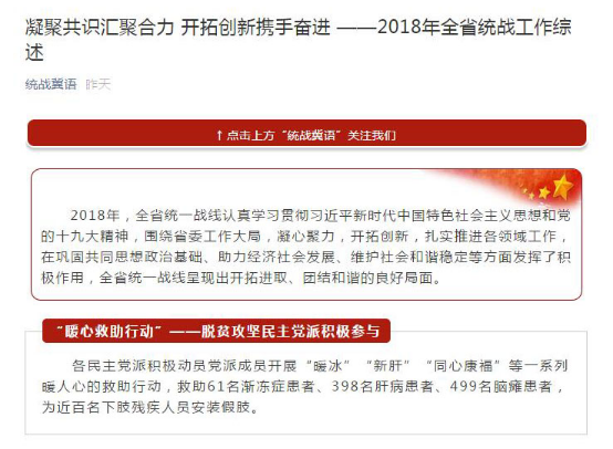 2019年1月27日,河北省委统战部公众号发布《凝聚共识汇聚合力 开拓创新携手奋进 ——2018年全省统战工作综述》。新肝行动作为民主党派参与脱贫攻坚工作的典型项目在文中被肯定。新肝行动是民盟河北省委和河北省红十字基金会共同发起主办的针对全国肝病患者的大型医疗救助项目,目前已成为民盟河北省委的社会服务品牌工作。此次在统战部的官方文章中被提出和肯定,标志着新肝行动进一步被社会和政府认可,也将为其今后的发展提供更大的动力。