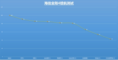 根据我们的续航实测数据,在经过了6小时的高强度续航模拟测试之后,海信手机金刚4剩余电量依旧达到惊人的43%,这意味着如果是一个中度偏重度的手机用户,那使用海信手机金刚4之后完全可以做到两天一充,平时不会有电量不足的担忧。