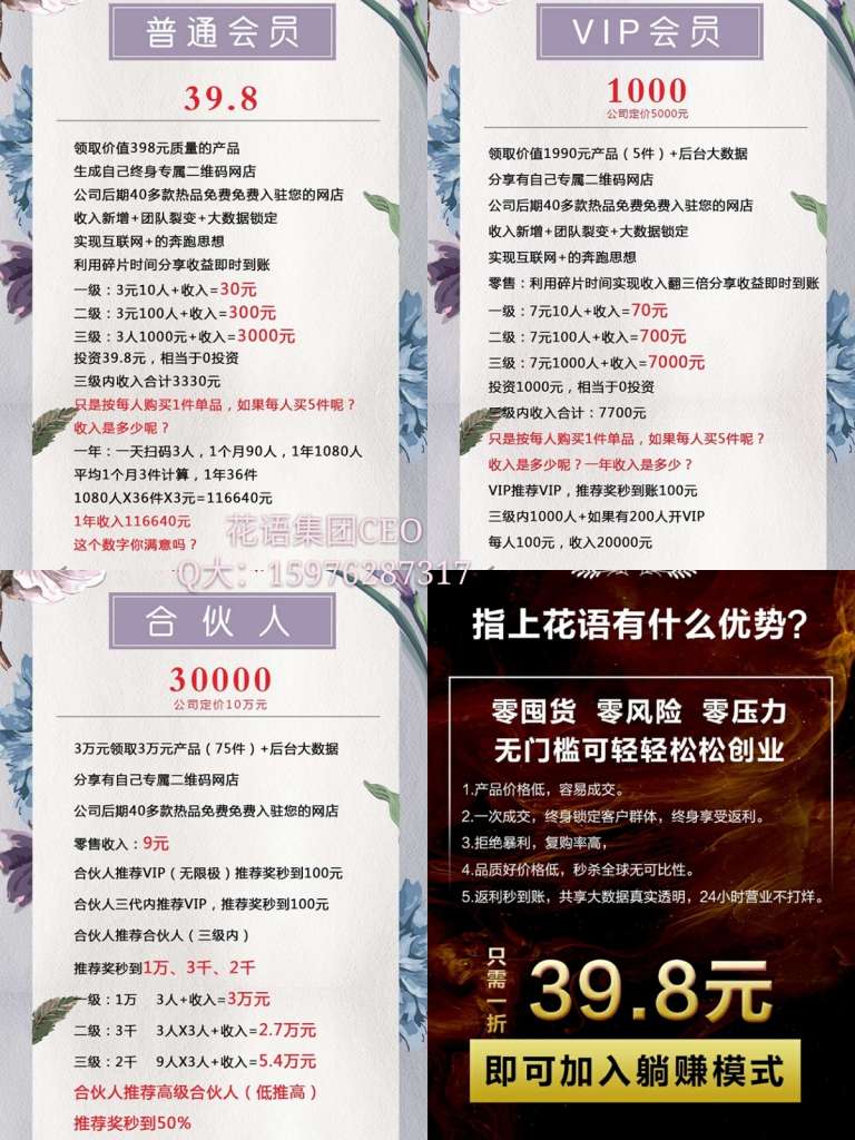 后期还有任务,大家可以百度。我们指上花语统一价格39.8,你还可以拿3层返利,只要有人消费,你就躺赚,收益倍增收益,稳赚不赔