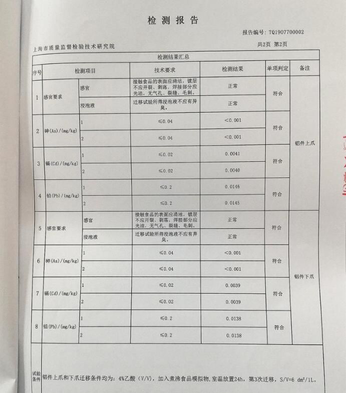 在现场,松江区市场监管局还向记者出示了一份该局抽样后委托上海市质检院进行检测的检测报告,检测对象是“天使之橙”现榨橙汁机的上下爪,检测依据就是上述的我国国家标准《食品接触用金属材料及制品》。经检测,相关部件的检测项目均符合上述标准。