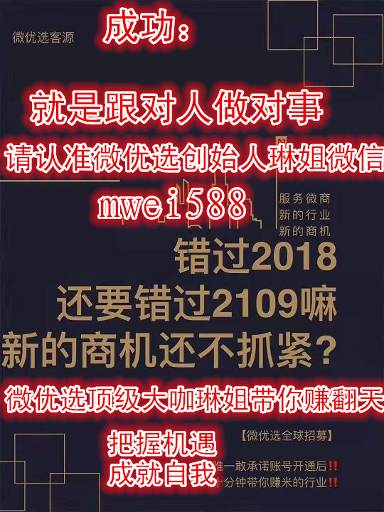 新市场!新机遇!现在加入就是第一吃吃螃蟹的!微优选创始人琳姐mwei588详情,抢占先机!每天前30位送琳琳姐实战引流秘笈!