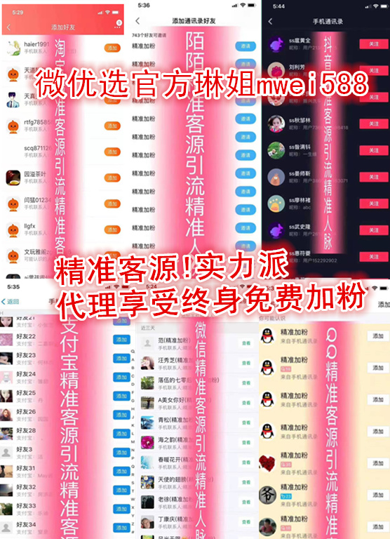 微优选功能一:加粉功能:活粉散客自于各大知名网店的后天数据全国各地的精准人脉供您选用!都是一些具有高消费能力的!同时微信、支付宝、淘宝、QQ、陌陌、快手、抖音只要是通过手机号注册的都可以通过我们微优选来提供精准客源