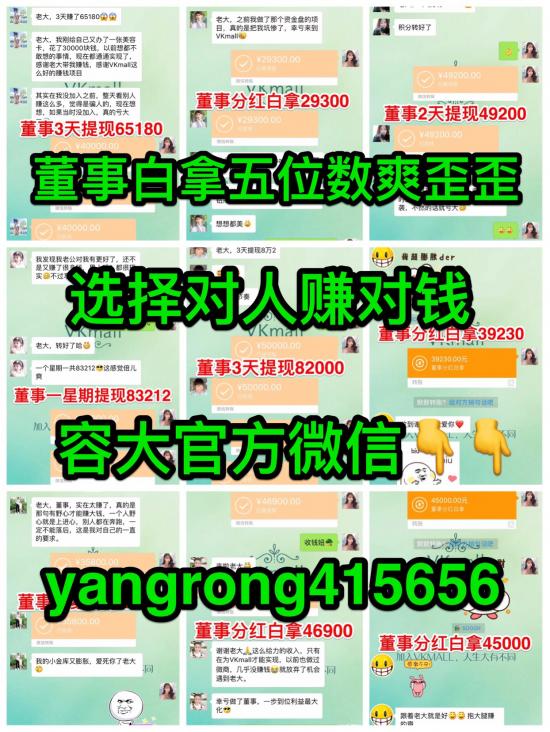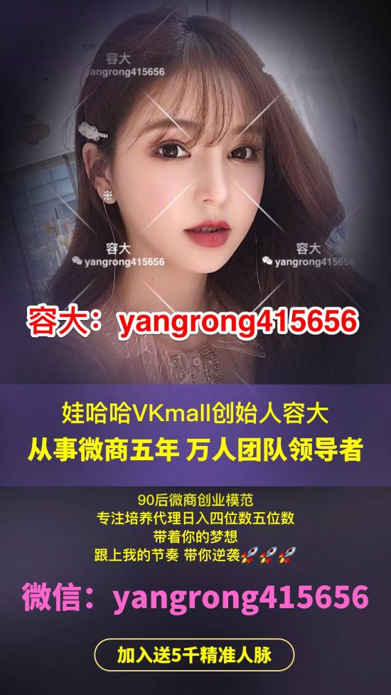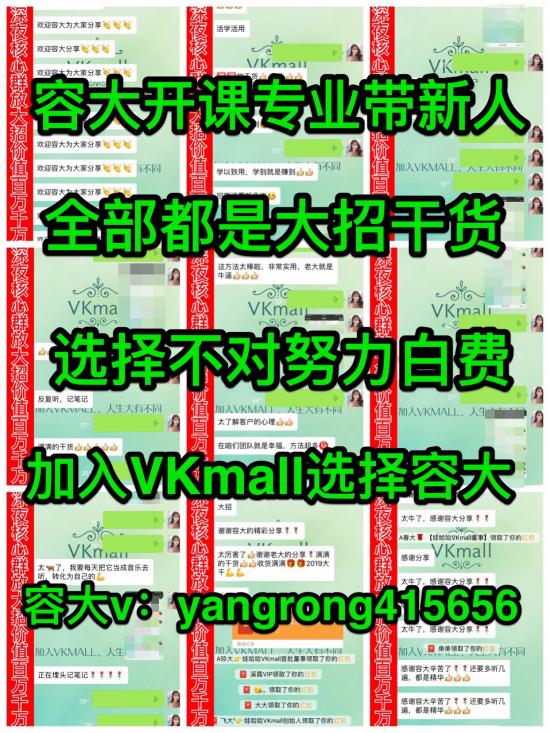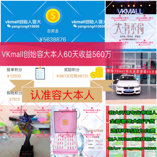 VKmall是史无前例微商界最牛逼的商业模式,静态稳拿公司总业绩3%的分红,动态推荐一个会员奖金6000,大公司➕好产品➕高额的奖励制度,现在是第一批,加入的都是吃肉的!不需要囤货压货,一次性投资终身受益!哪怕你什么都不干也能挣钱,每周都有高额奖金分红拿!永久分红!VKmall容大微信:yangrong415656