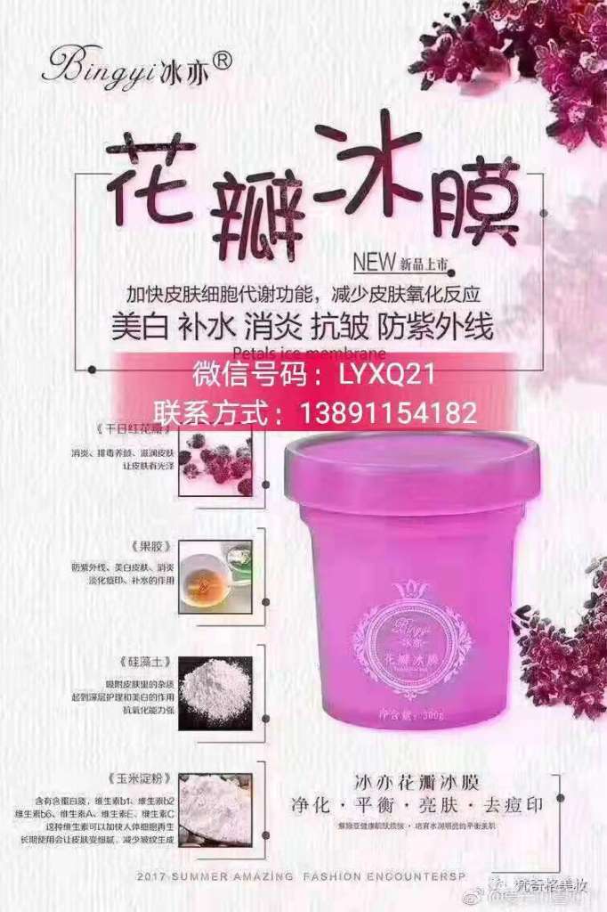 冰亦花瓣冰膜采用了100%纯植物提取精华,含有硅藻土.玉米淀粉.果胶.千日红花瓣.狭叶越桔果提取物、积雪草提取物、海洋糖蛋白、黄瓜提取物等精华成分,采取药学标准纳米超微渗透技术,以液态形式快速打通皮肤通道,深渗肌肤底层,水分和养分被细胞瞬间吸收,修护因日晒等原因造成的肌肤损伤,皮肤10-15分钟后即呈现水润白嫰状态。用冰亦花瓣面膜令肌肤水润紧致,细腻动人!没有任何激素和防腐剂,不会造成肌肤的二次污染。孕妇小孩敏感肌肤都可以放心使用。