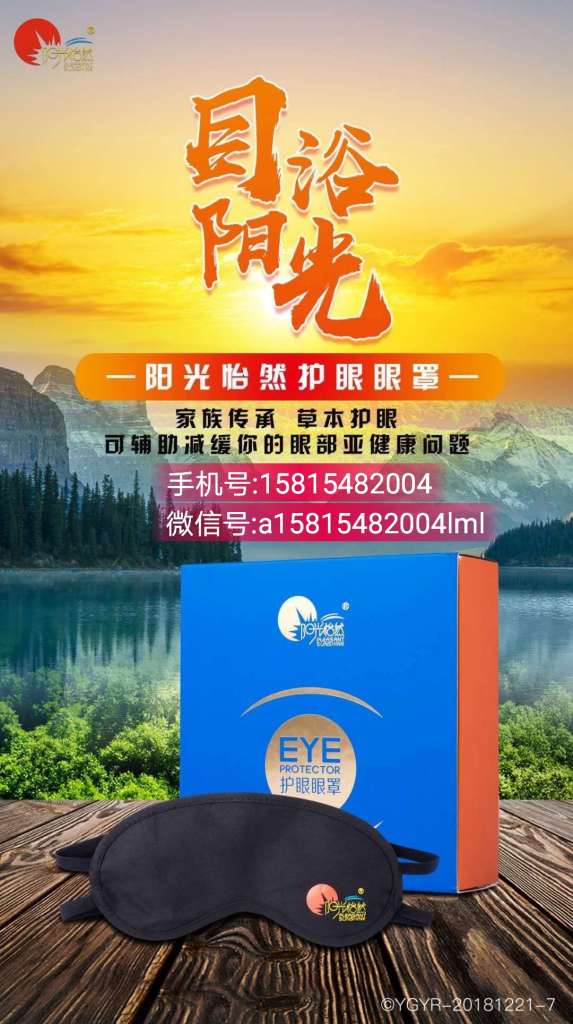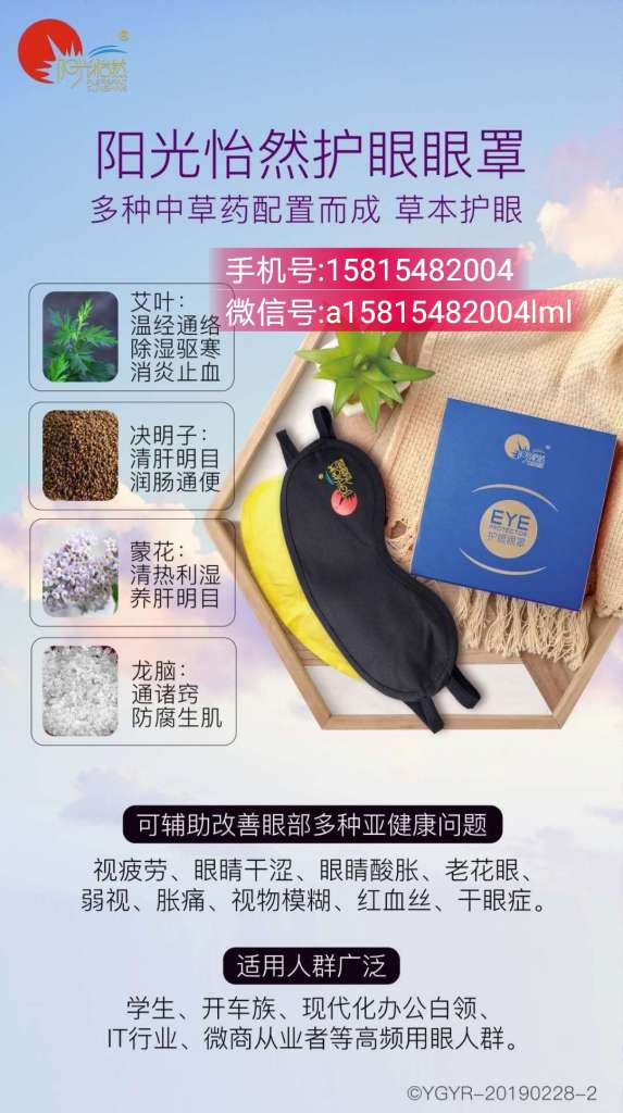 现在我们一天的用眼程度是3年前的5倍以上?未来3年中国的眼科医院将会挤满人?互联网时代是财富的时代保护好眼睛比赚取财富更重要?阳光怡然护眼眼罩是您的护眼好伴侣!巨大的市场需要我们。官方微信号:a15815482004lml 手机号:15815482004