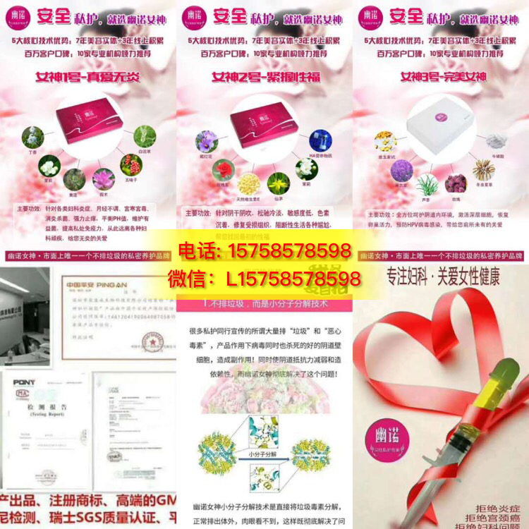 幽诺女神采用高科技智能溶菌技术,把体内的毒素分解成小分子正常代谢,不需要护垫,不拒绝同房,经过8年实体店的沉淀,4年微商市场的积累,幽诺女神私护2017销量突破2000万套,获广东省315诚信企业,诚信品牌奖,2016年度中国女性生殖健康突出贡献奖,CCTV战略合作伙伴