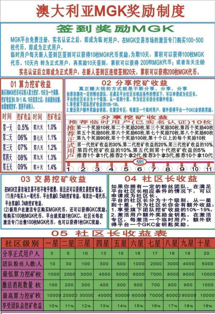 澳大利亚MGK挖矿这个项目是2018年8月份开始的,简单来说,MGK就是一个存币挖矿赚息的盘子,只要免费注册实名认证之后你就是临时会员了,但是它是相当于一台永久挖矿机,每天为你挖矿挖出的mgk是可以随时卖出提现的。持币算力挖矿月收益30%以上,动态推广十级团队收益,收益上不封顶,静态动态皆赚钱。
