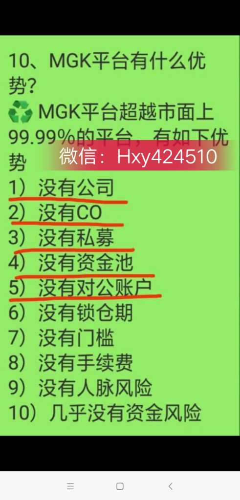 2019年是各项事业的新起点,加入MGK,让你华丽逆袭,收获人生第一桶金!抓住MGK=抓住了钱!啥项目都别搞了,好好做MGK钱包吧!从此孩子奶粉钱有了,尿不湿钱有了,再也不用去捡地摊货了,带你月入过十万万,赚它一个亿!没毛病!往死里干!mgk挖矿对接陈总,咨询热线,微信:Hxy424510