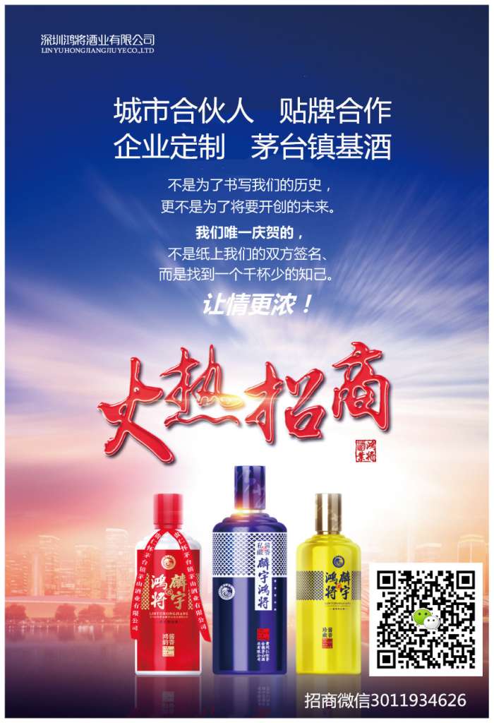 深圳麟宇鸿将酒业公司创立于2009年,公司以贵州茅台镇酱香白酒协会为依托,整合茅台镇酒业优质资源,现已拥有全产业链中高端白酒的酿造、销售、代理及配套服务解决方案,依托麟宇鸿将品牌影响力,在国内设立了百余家品牌代理,建立了覆盖全国的酒品销售服务体系。时光荏苒中,传承古法酿造工艺,我们以弘扬中华酒文化为己任,不断挖掘酿造品质美酒的奥秘,树立起麟宇鸿将酱香白酒的良好口碑和声誉。“鸿鹄之志 将者雄心”品味中华酒文化之精髓,酿享誉万代之美酒,致力打造中国中高端白酒第一品牌!