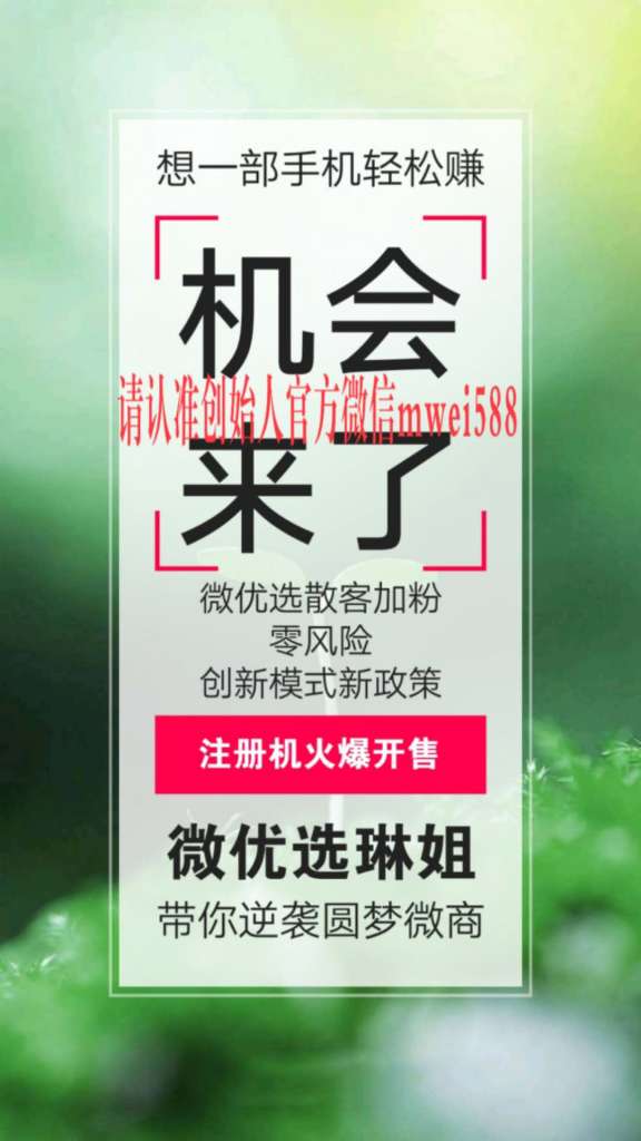 微优选精准人脉注册机上市现全球火爆招商中。。。。。。现在加入就是第一批吃螃蟹的!微优选琳姐【mwei588】期待你的到来,一起共创辉煌!