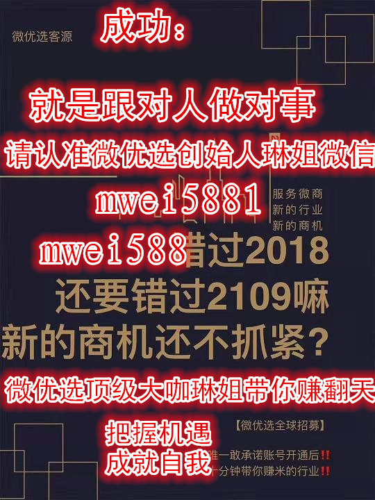 微优选最强战队50万团队领导者总负责人琳姐, 5年微商实战干货经验,掌握微商线上线下多种引流秘笈,互联网精准引流第一人,金牌讲师,亲自一对一培训指导,手把手带你逆袭,本着诚信微商做事先做人的原则,让加入微优选的每个销售会员有钱赚,轻松创业,不管你是学生,上班族,还是宝妈,只要你会玩手机不懒听话照做,琳姐带你一样完美逆袭,年赚百万!快速成就不一样的自己!圈子对了钱就像呼吸一样简单!赶快拿起手机添加琳姐财富微信【mwei5881】【mwei588】实力大咖手把手带你赚!