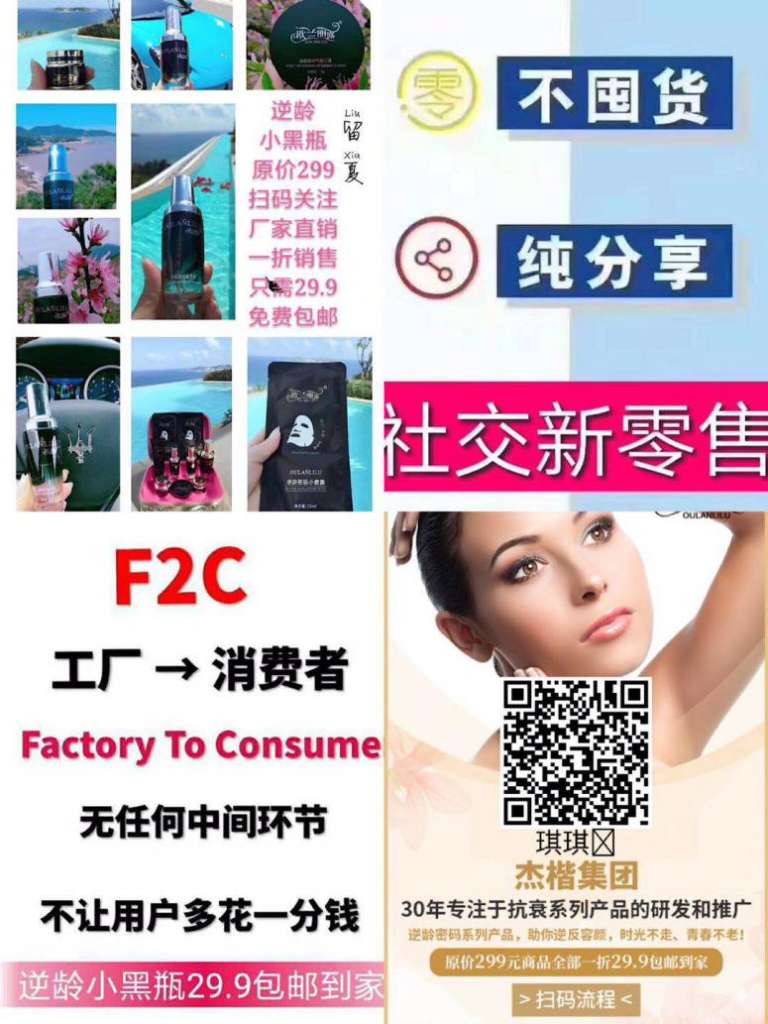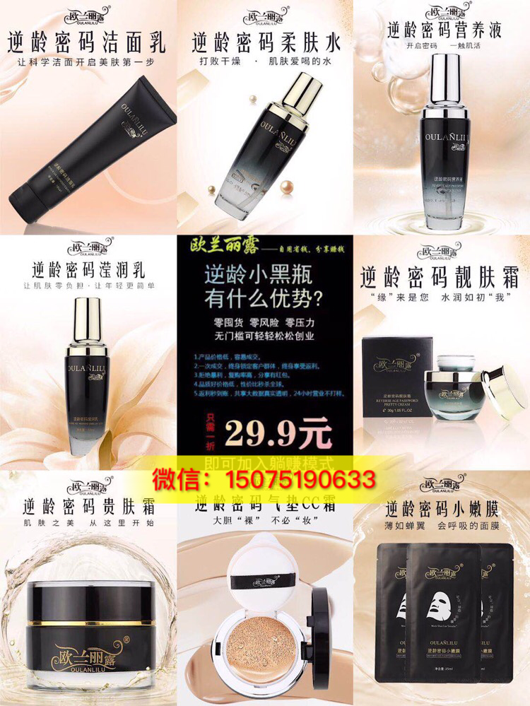 欧兰丽露系列产品,一次性通过国际认证,出口62个国家免检,公司打造的逆龄焕颜系列,为上市,一折抢占市场,全国统一价格299元,扫描二维码一折29.9包邮,只要购买1瓶就可以代理整个商城产品!