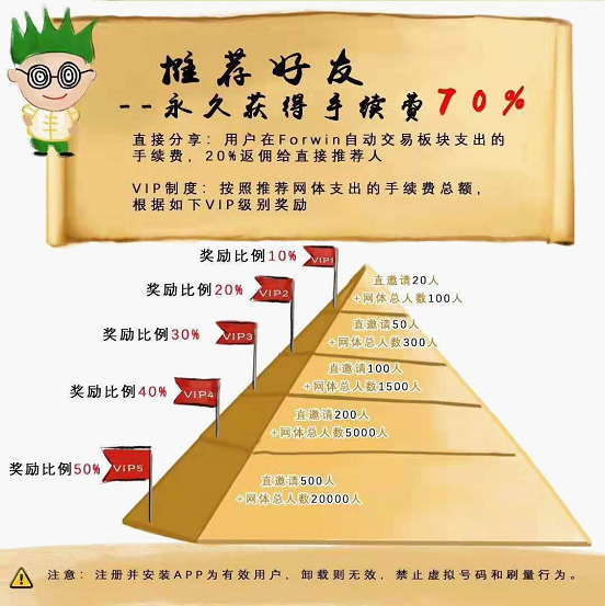 想要获得邀请码可以与我们联系,下载注册后就可以免费体验、免费试用了。下面详细介绍一下的佣金制度:Fowin是采用了VIP制度,整个推荐网体佣金,根据VIP级别奖励,最高50%佣金。一共分为5个vip等级,级别越高可以拿到的比例也就越高。