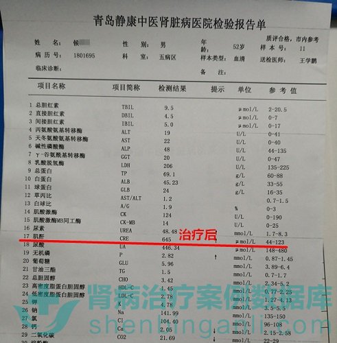 妹妹得知此事后,向哥哥推荐了青岛静康中医肾脏病医院,并告诉他,静康中医治疗肾病效果非常好,自己在静康治疗后,肌酐下降了300多,目前病情已经控制稳定。